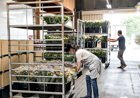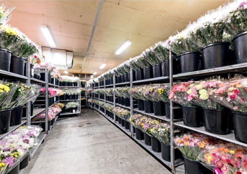 加工された花は、一定時間冷蔵庫内で給水処理。お客さま指定の輸送方法で出荷いたします。